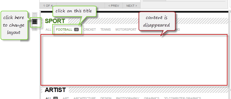 <p>For example I clicked on subcategory 'football' and after I got articles i pushed the same subcategory again after that I got only blank screen. It's the same with any other subcategory even with 'ALL'.</p>