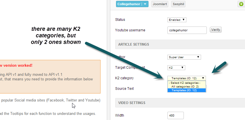 The social profile does not show all K2 categories in selection list. There is only one or two categories are shown.